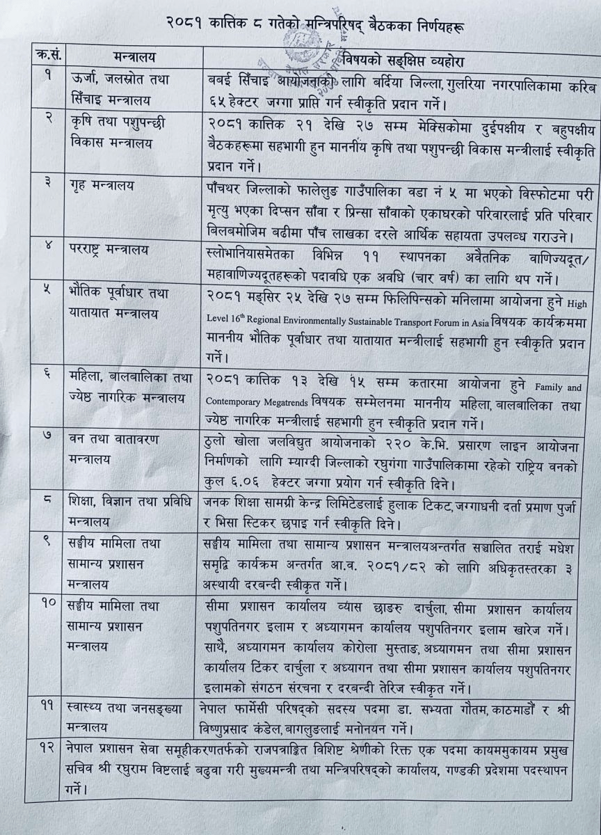 काठमाडौं- बिहीवार बसेको मन्त्रिपरिषद् बैठकका निर्णयहरू सार्वजनिक भएका छन् ।