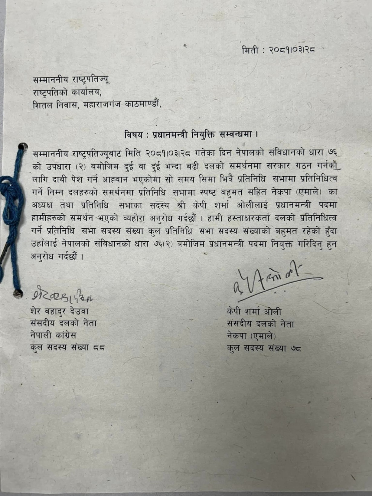 राष्ट्रपति रामचन्द्र पौडेलले नेपालको संविधानको धारा ७६ को उपधारा (२) बमोजिम प्रधानमन्त्री पदका लागि दाबी पेस गर्न आह्वान गरेलगत्तै ओलीले नेपाली कांग्रेसको समर्थनमा प्रधानमन्त्रीको दाबी पेस गरेका हुन्।