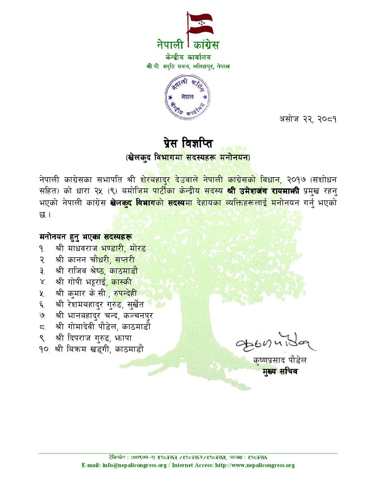 पार्टी केन्द्रीय सदस्य उमेशजंग रायमाझी प्रमुख रहेको खेलकुद विभागको सदस्यमा १० जना मनोनयन गरिएको काँग्रेस केन्द्रीय कार्यालयका मुख्य सचिव कृष्णप्रसाद पौडेलले जानकारी दिए ।