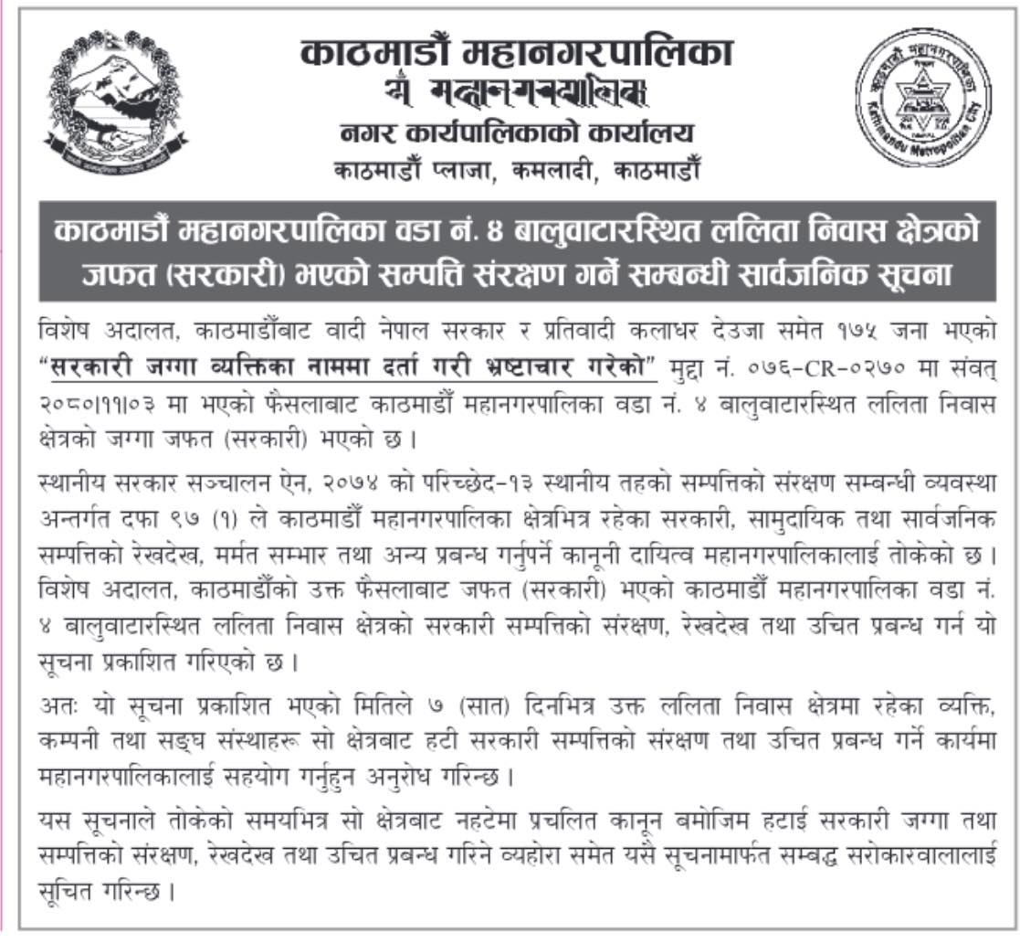 बुधबार सूचना जारी गर्दै महानगरले विशेष अदालतको फैसलासँगै उक्त जग्गा सरकारी भएकोले ललिता निवास क्षेत्रमा रहेका व्यक्ति, कम्पनी तथा संघ–संस्थाहरूलाई उक्त क्षेत्र खाली गर्न भनेको हो । स्थानीय सरकार सञ्चालन ऐन २०७४ को परिच्छेद १३ स्थानीय तहको सम्पत्तिको संरक्षण सम्बन्धी व्यवस्था अन्तर्गत दफा ९७ (१) ले काठमाडौँ महानगरपालिका क्षेत्रभित्र रहेका सरकारी, सामुदायिक तथा सार्वजनिक सम्पत्तिको रेखदेख, मर्मत सम्भार तथा अन्य प्रबन्ध गर्नुपर्ने कानुनी दायित्व महानगरपालिकालाई तोकेको ले ललिता निवास खाली गराउन महानगरले सक्रियता थालेको हो ।