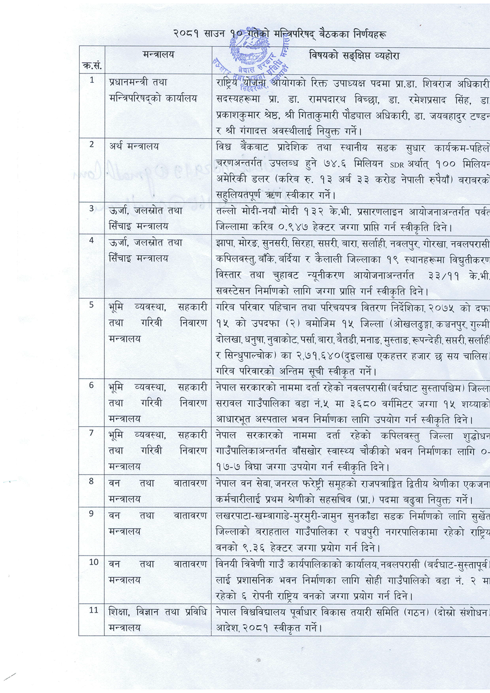 साउन १० गते बसेका मन्त्रिपरिषदको बैठकका निर्णय सोमबार सार्वजनिक गरिएको हो ।