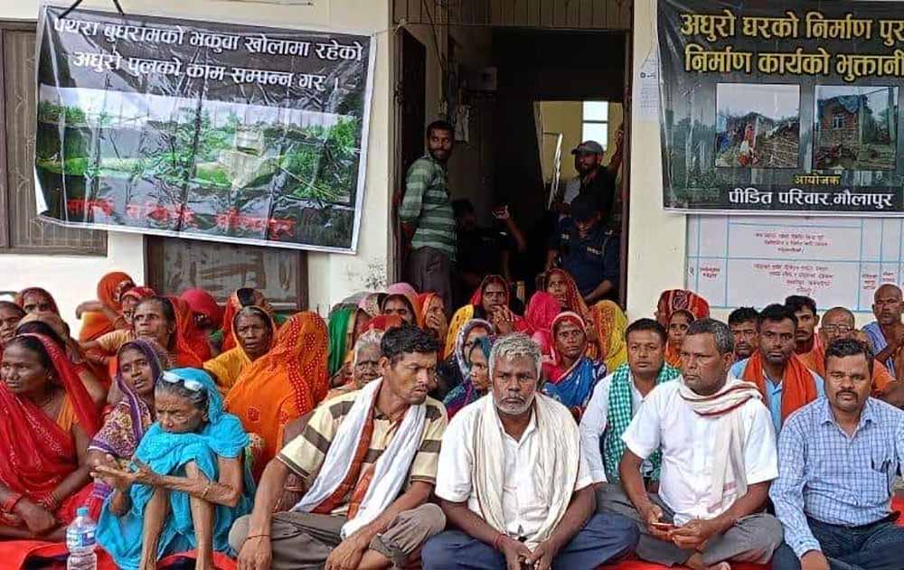 मोर्चाका अध्यक्ष एवं जनता अवास कार्यक्रम संघर्ष समिति मौलापुरका संयोजक ठागा दासको नेतृत्वमा भुक्तानीको माग गर्दै निरन्तर आन्दोलन गर्दै आएका छन। संघर्ष समितिले पूर्वाधार विकास कार्यालयमा तालाबन्दी गरेर धर्ना बस्नेपछि सरोकारवाला आज दुईपक्षीय बार्ता भईरहेको छ ।