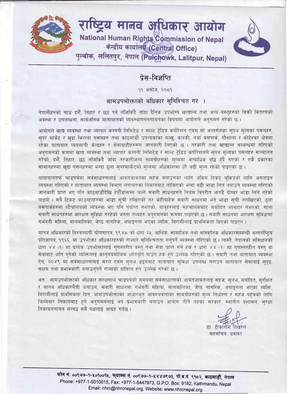 आयोगले भनेको छ- 'आम उपभोक्ताको अधिकार संरक्षणार्थ चाडपर्वको समयमा सर्वसाधारणको आवतजावतलाई सहज, सुलभ, मर्यादित, सुरक्षित र मानव अधिकारमैत्री बनाउन जरुरी छ । सवारी साधनमा गर्भवती, बालबालिका, ज्येष्ठ नागरिक, अपाङ्गता भएका व्यक्ति, बिरामीलाई प्राथमिकता दिन, आम उपभोक्ताका आधारभूत आवश्यकताका सामग्रीको मूल्य निर्धारण र सहज पहुँचका लागि जिम्मेवार निकायबाट हुने अनुगमनलाई थप प्रभावकारी बनाउन तीनै तहका सरकार, स्थानीय प्रशासन, सुरक्षा निकायलगायत सम्बद्ध सबै पक्षलाई आग्रह छ ।”
