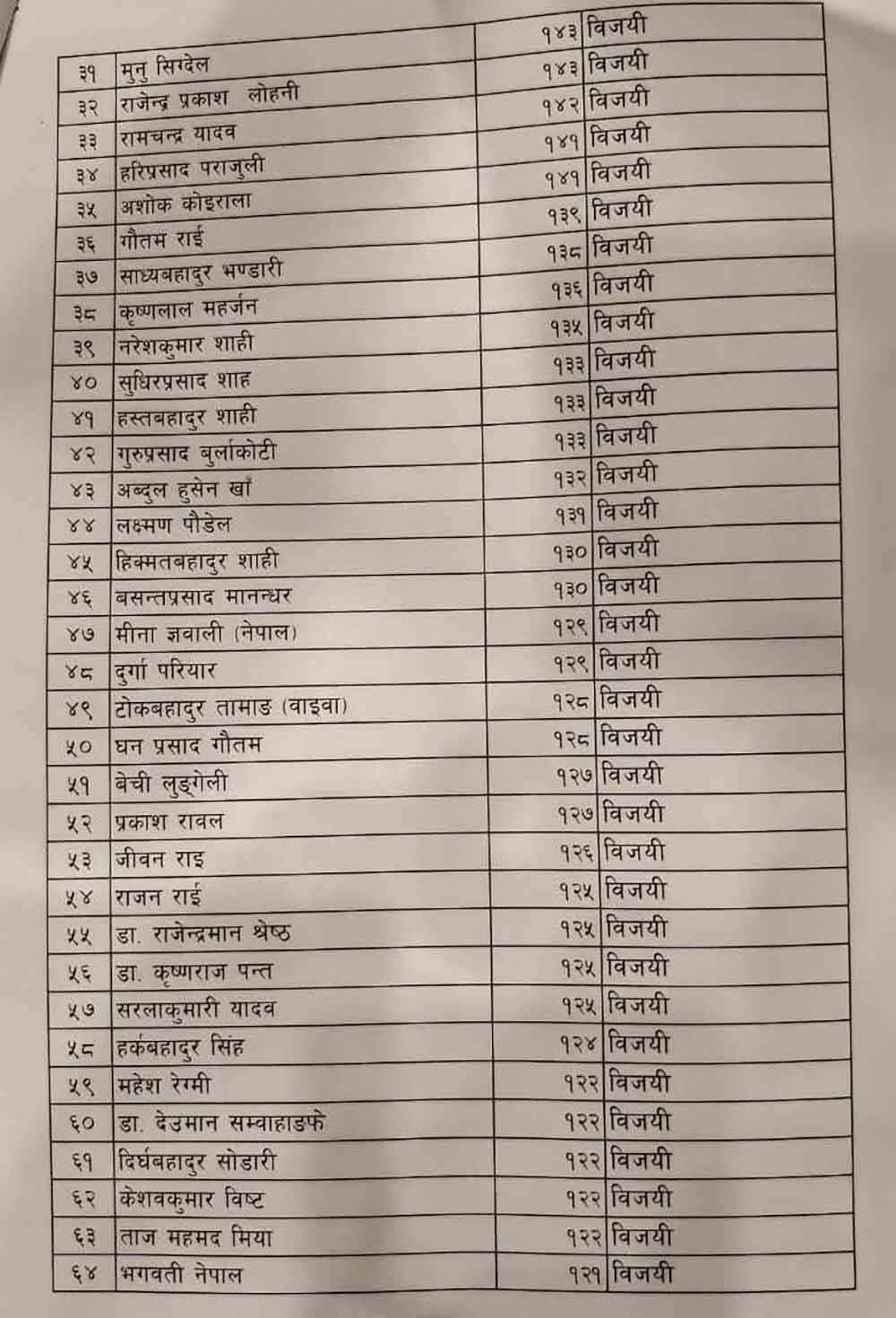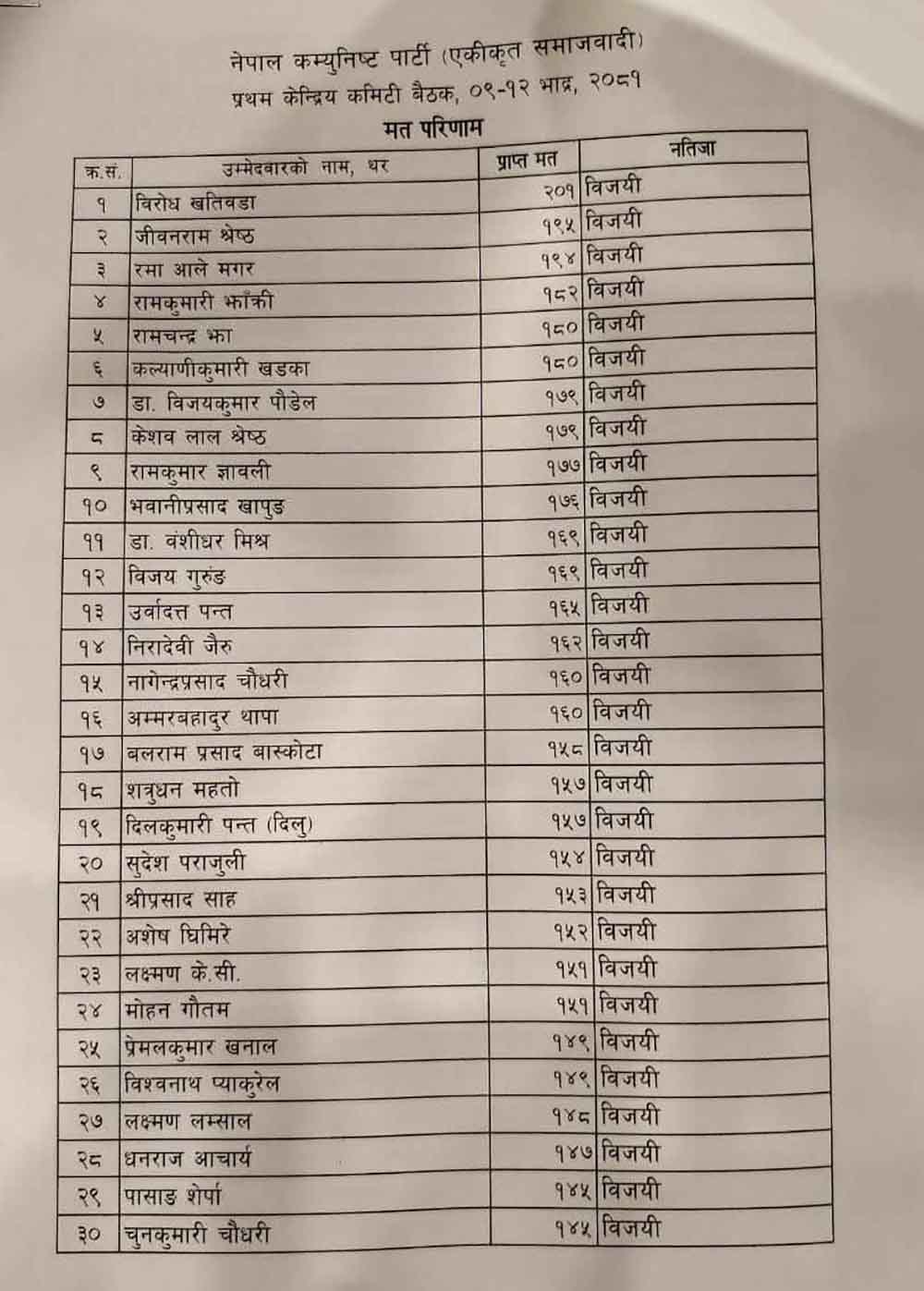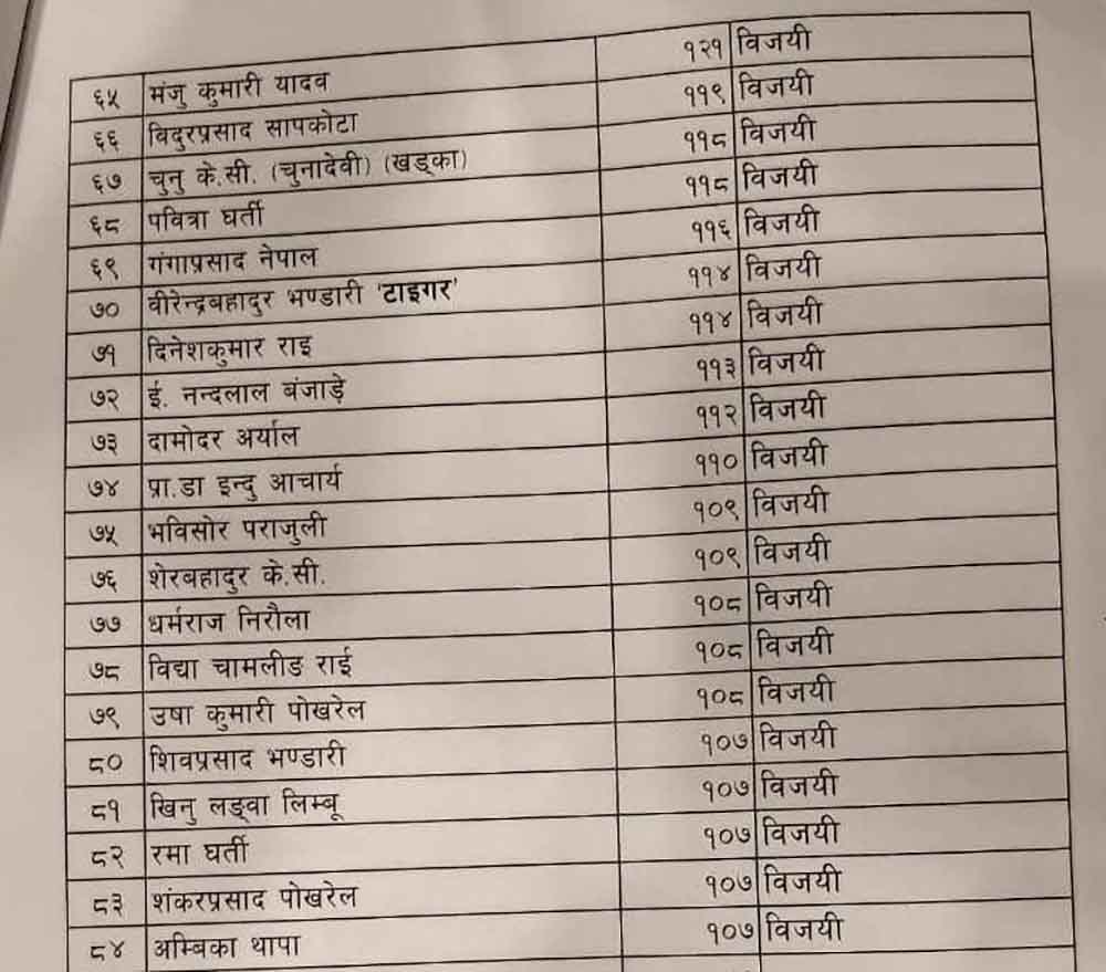 प्राप्त मतपरिणाम अनुसार विरोध खतिवडाले सबैभन्दा बढी २०१ मत प्राप्त गरेर विजयी भएका छन् । त्यस्तै जीवनराम श्रेष्ठ १९५, रमा आलेमगरले १९४ र रामकुमारी झाँक्रीले १८२ मत पाएर विजयी भएका छन् । ८४ जना विजयी हुदा सबै भन्दा कम मत १०७ ल्याउने पाँच जना रहेका छन् ।
