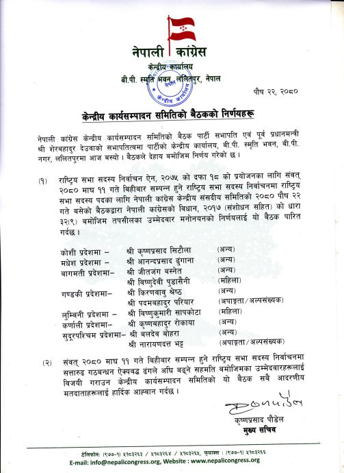 काठमाडौं : राष्ट्रिय सभा निर्वाचनका लागि नेपाली कांग्रेसले उम्मेदवारहरु टुंग्याएको छ । आइतबार बसेको केन्द्रीय कार्यसम्पादन समितिको बैठकले उम्मेदवार टुंग्याएको भन्दै सोमबार बिहान निर्णय सार्वजनिक गरिएको छ ।