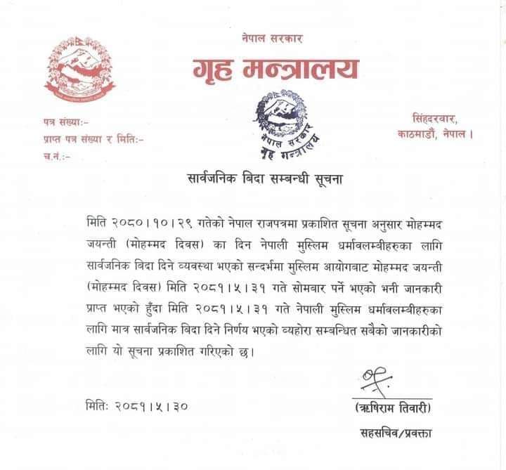 गृह मन्त्रालयले आइतबार सूचना जारी गर्दै मुस्लिम आयोगबाट मोहम्मद जयन्ती आजै भएको भनी जानकारी प्राप्त भएकाले सोमबार सार्वजनिक बिदा दिइएको जनाएको छ।