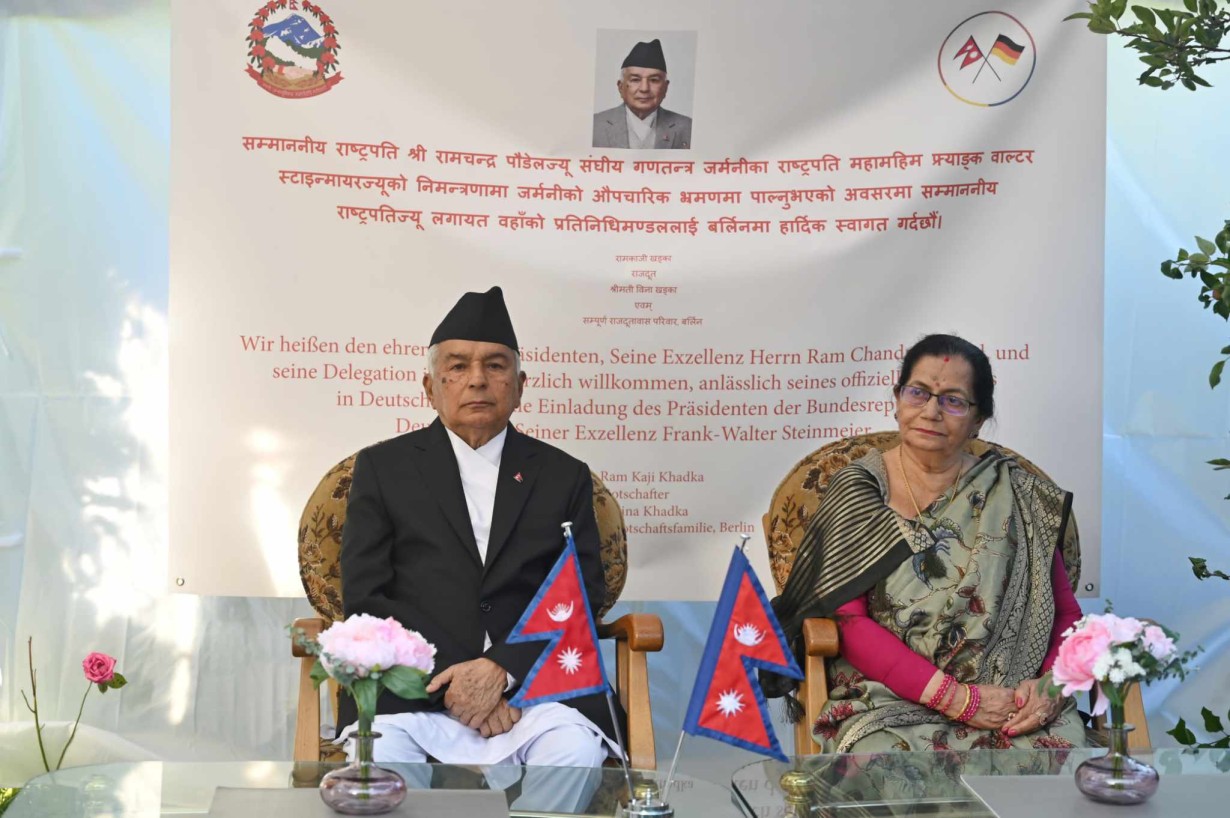 वर्लिन- मित्रराष्ट्र जर्मनीको भ्रमणमा रहेका राष्ट्रपति रामचन्द्र पौडेलको सम्मानमा जर्मनीको वर्लिनस्थित नेपाली राजदूतावासले आाइतबार विशेष स्वागत समारोह आयोजना गरेको छ।