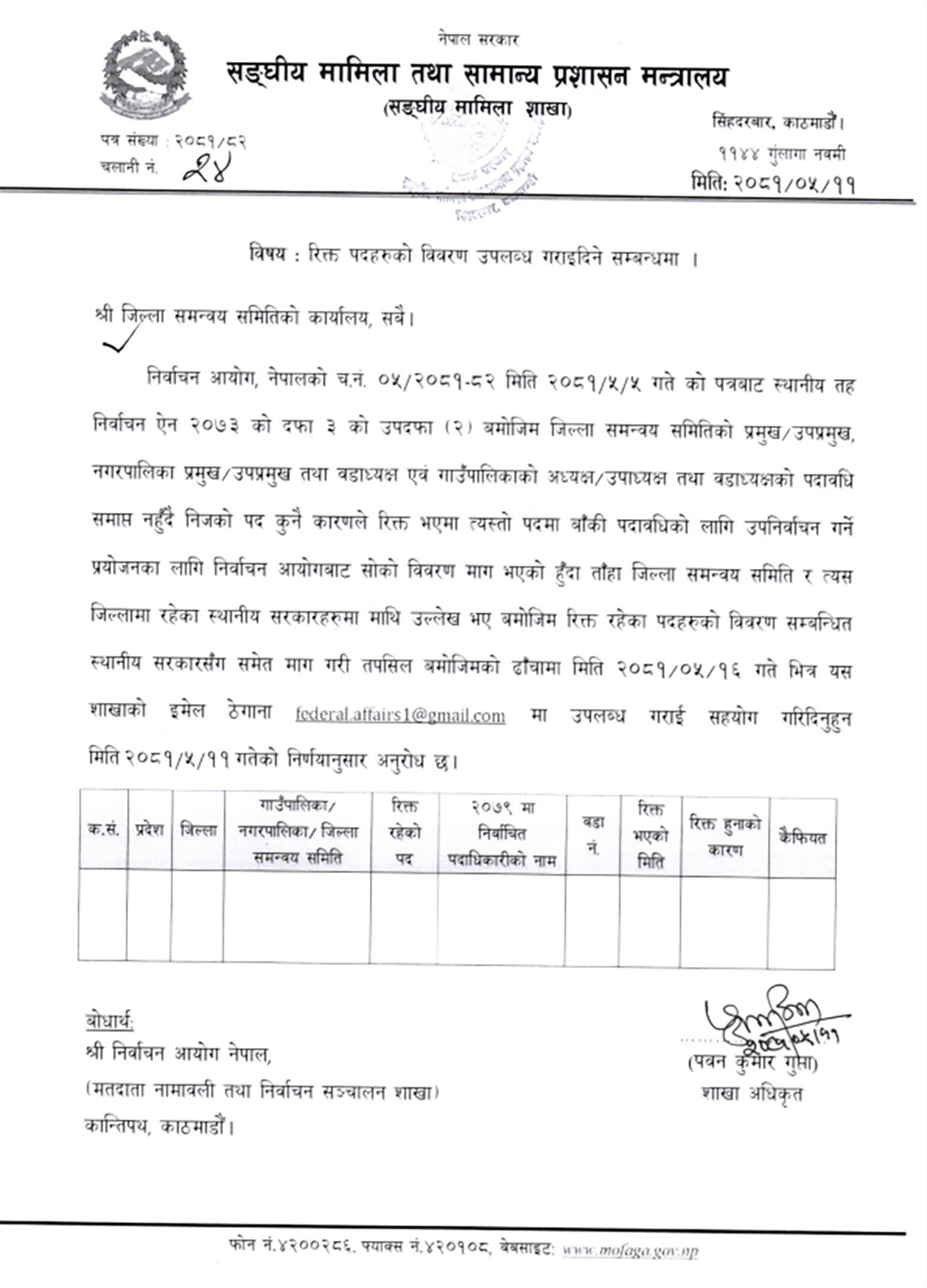 जिल्ला समन्वय समिति प्रमुख, उपप्रमुख, नगरपालिका प्रमुख, उपप्रमुख तथा वडाध्यक्ष एवं गाउँपालिका अध्यक्ष, उपाध्यक्ष तथा वडाध्यक्षको पदावधि समाप्त नहुँदै निजको पद कुनै कारणले रिक्त भएमा त्यस्तो पदमा बाँकी पदावधिका लागि उपनिर्वाचन गर्ने प्रयोजनका लागि निर्वाचन आयोगबाट सोको विवरण माग भएको भन्दै मन्त्रालयले यस्तो परिपत्र गरेको हो ।